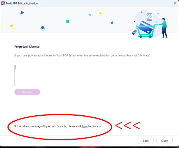 2. On the next window, there will be an option to put in a Perpetual License. Further down, there is a note that says "If this Editor is managed by Admin Console, please click here to process." Click the link in that statement.