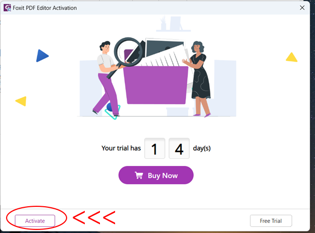1. Launch Foxit PDF Pro and click the “Activate” button in the lower left corner of the activation window that opens.